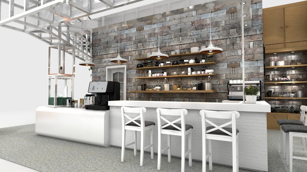 來做設計在這個攤位範例中採用網格狀(柵欄式)的門眉做設計,而攤位主視覺面設定為咖啡區的情境模擬,在選材上採用磚紋貼皮,前方bar台區也增加三張小椅子來呈現咖啡bar的情境,側邊在搭配植物牆的設計,在細節的處理方式能夠帶出不同的視覺感受,燈光的處理也以垂吊式燈具點綴強化空間視覺,增加細節及精緻感。