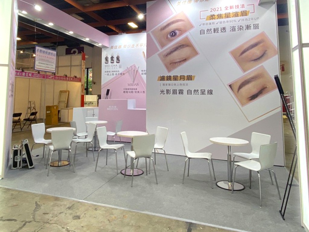 為了能讓觀展者一眼就現場實際施作的過程,來做設計將展示區規劃在展位的頂角,處於展場通道的交會處,人潮交會最頻繁的位置,設置美容床與紋繡器材,直接現場透過大電視連線直撥,展示專業美妝師的紋繡技法給路過參加的民眾,吸引人潮駐足、激發好奇心、刺激現場消費。