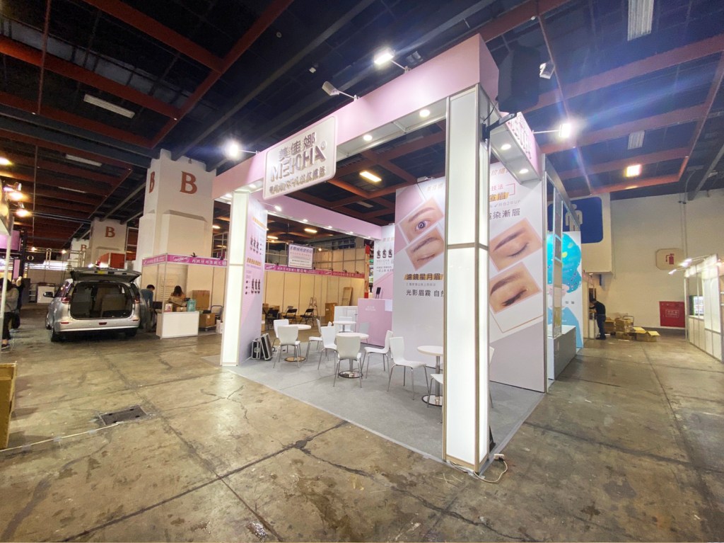 這次美佳娜參加的春季美容展屬於消費型的大型展會,攤位為三面開-半島形攤位,整體風格設計與環繞門楣運用了美佳娜形象色作為的配色,4米高的門楣設計,不但大器且具有專櫃質感,門楣下方設置崁燈,增加整體照明外更提升整體形象的光采度與明亮度。