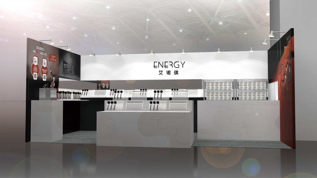這次艾諾琪參加春季美容展屬於消費型的大型展會,選擇大會基本的一面開攤位,但是攤位鄰柱且柱上設有展館消防設備,因展館規定,必須在消防設備前開口,以便緊急時刻的使用,為不讓開口破壞攤位美觀,來做設計便以流蘇門簾遮擋,偽裝成倉庫入口,更提升攤位整體質感。為讓整體攤位視野更開闊,採用了無門楣的設計,並利用大範圍鏡面的通透感,增加空間感,而整體風格則使用艾諾琪企業形象色作為配色。