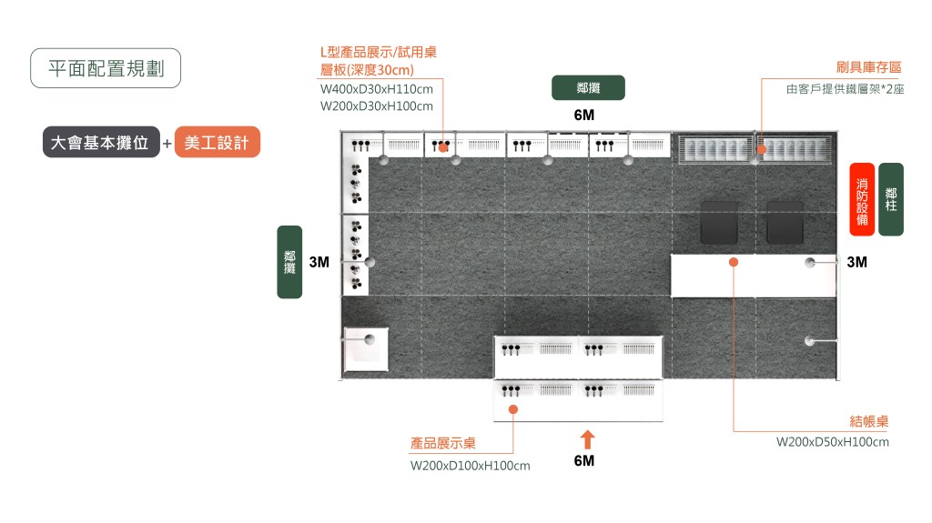 本次攤位的選擇為大會基本的一面開攤位,單面臨走道,是能夠很好聚集民眾的類型,相較於其他類型的攤位,在攤位設計的規劃比較單純,可以產生良好聚焦的效果。