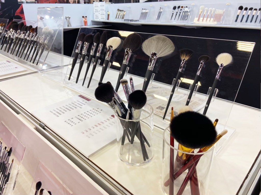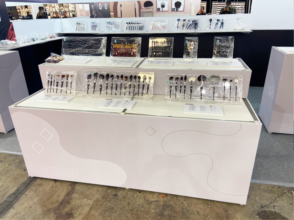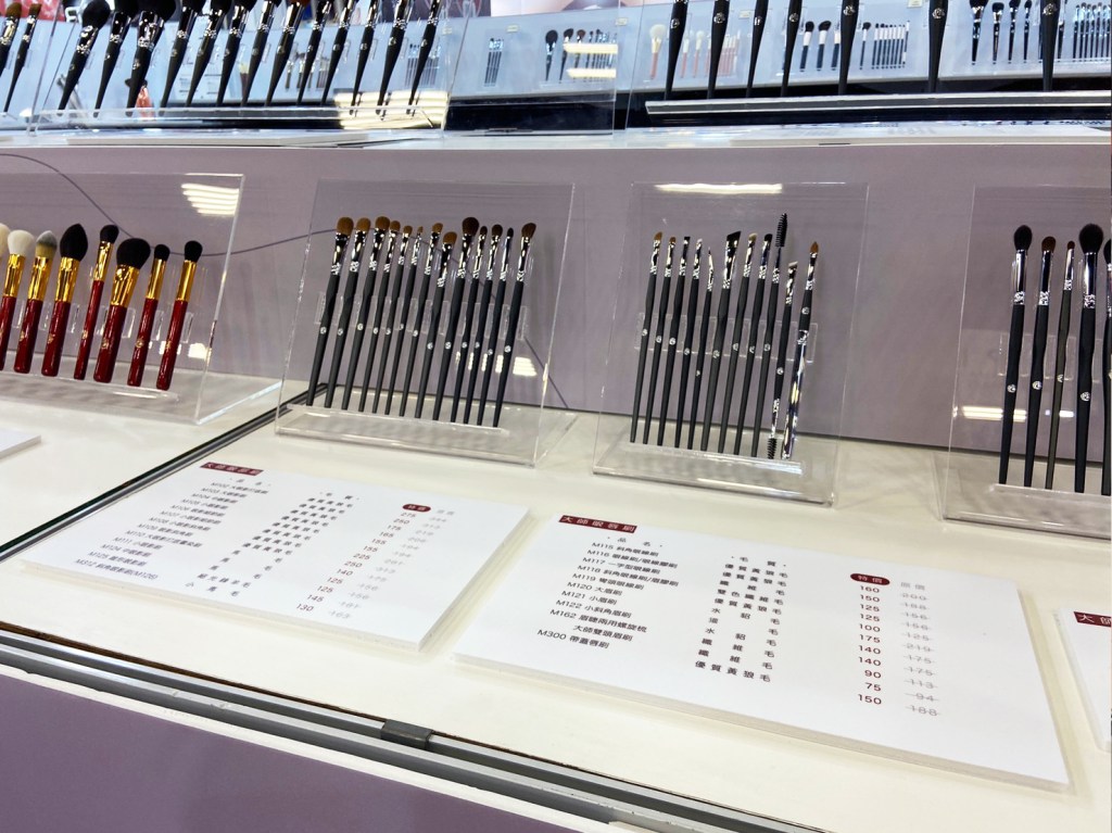 艾諾琪展出的重點銷售自家彩妝刷具產品,為讓民眾能夠更直接挑選與比較產品,特別將套裝商品區分展示於牆面的展示架上,並使用雙層展櫃,置放於走道邊吸引路過參加的民眾,激發好奇心、吸引人潮駐足、並規劃摸彩與展會限定促銷活動刺激消費。