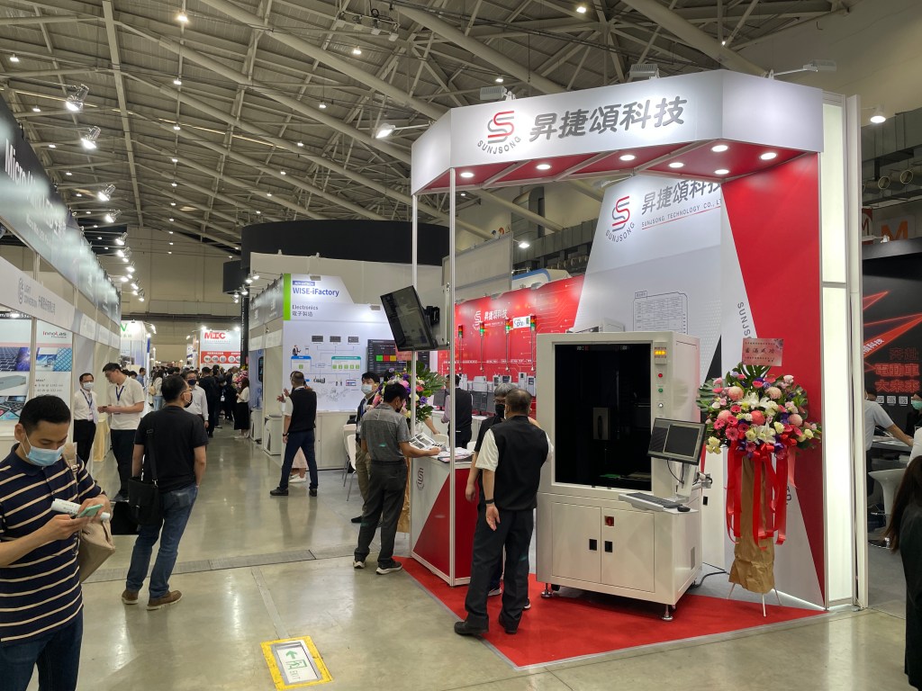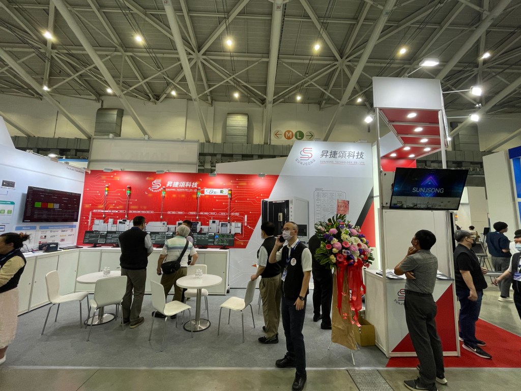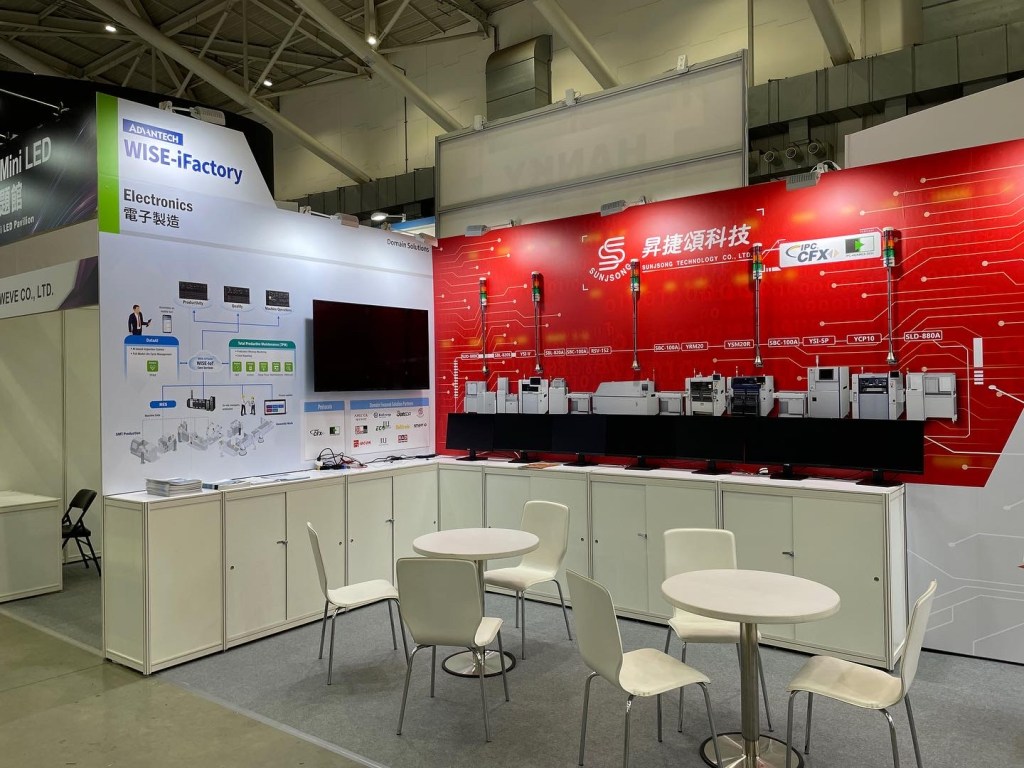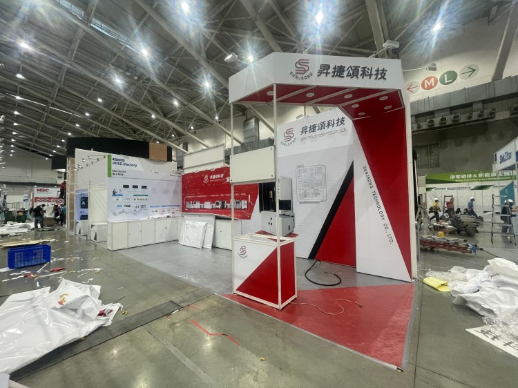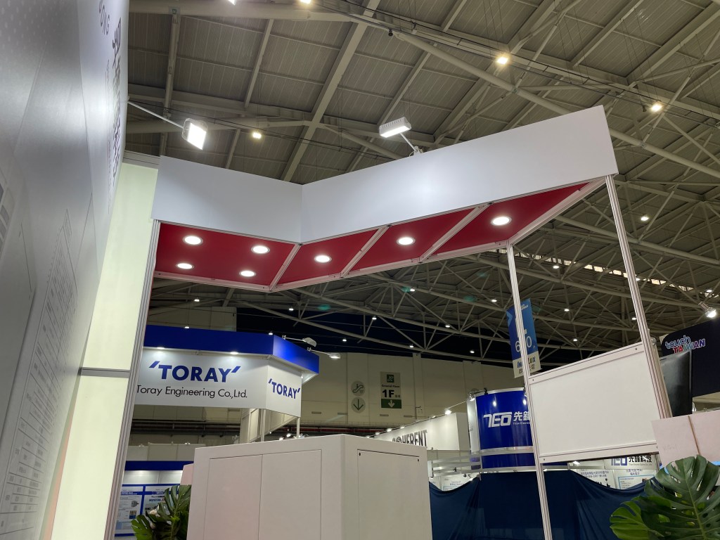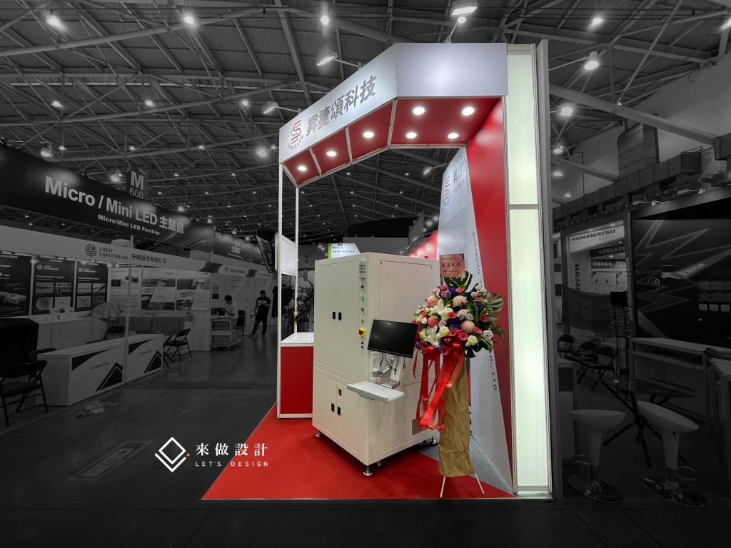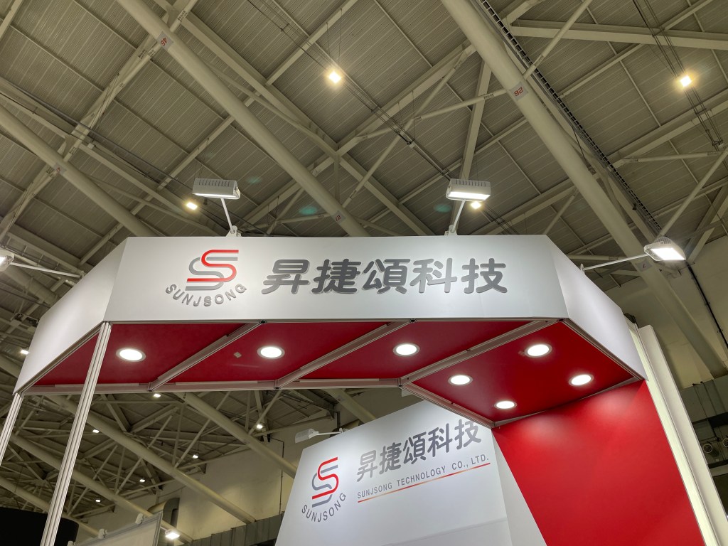 本次昇捷頌科技參展著重於新機台的展示,因此在展覽攤位的走道交接處特別設置了展示區域,並大量使用長柄燈、燈箱、崁燈等照明設備做出聚焦的效果,吸引同業與參展民眾關注、了解客戶的新機台產品。