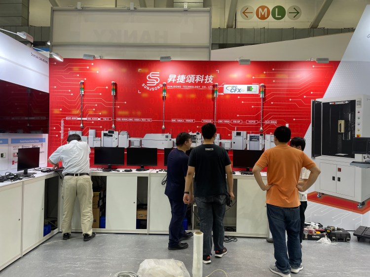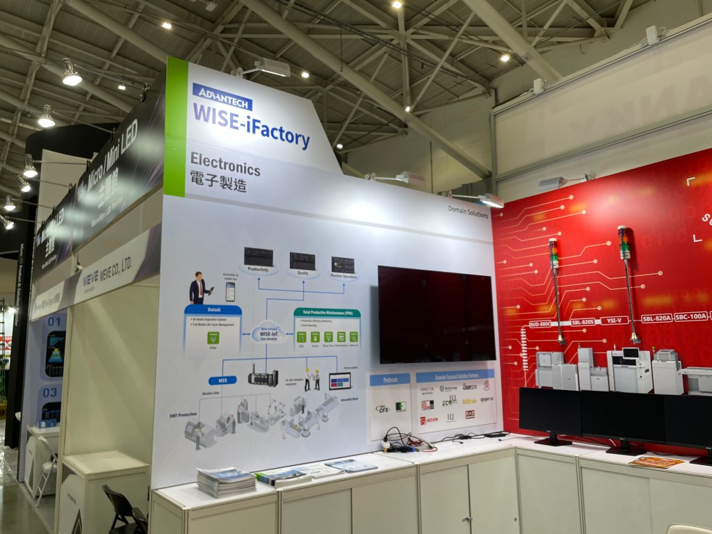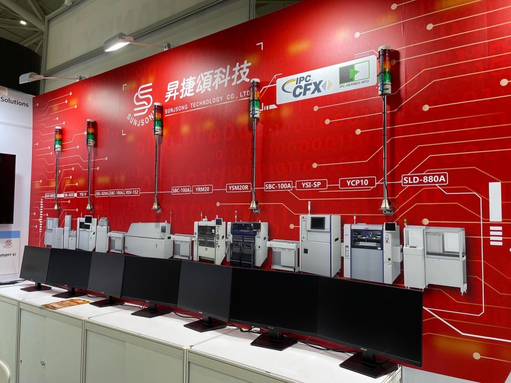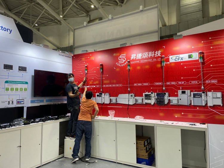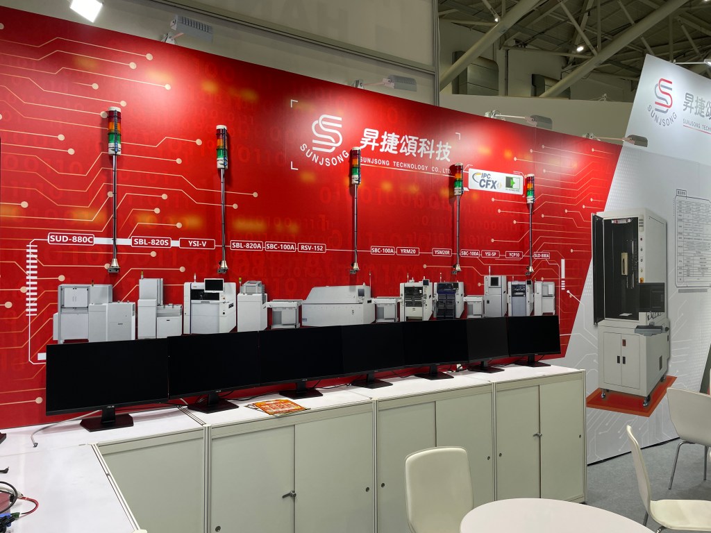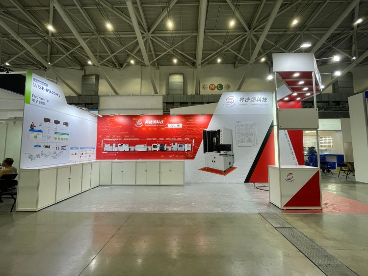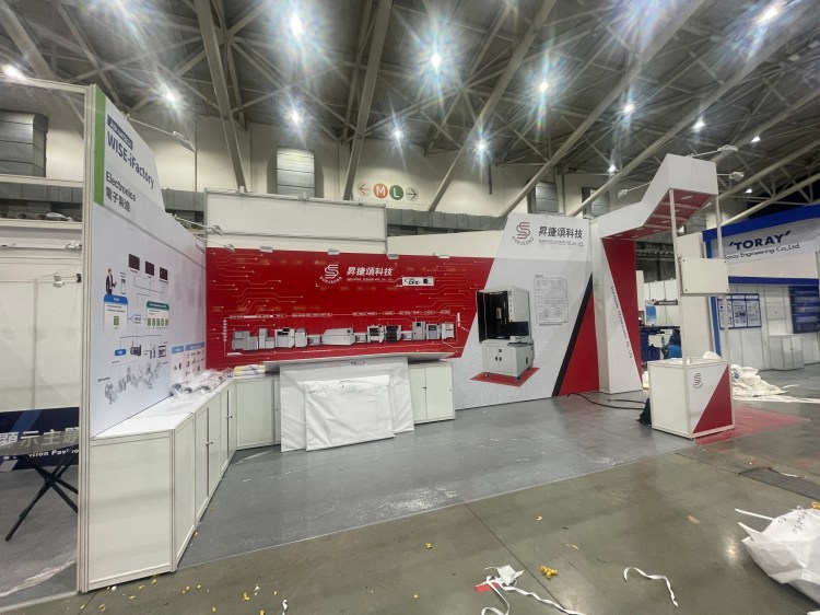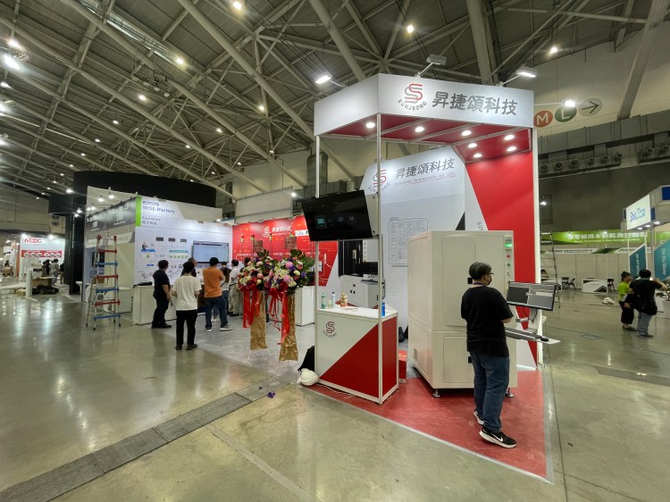 本次昇捷頌科技參展著重於新機台的展示,因此在展覽攤位的走道交接處特別設置了展示區域,並大量使用長柄燈、燈箱、崁燈等照明設備做出聚焦的效果,吸引同業與參展民眾關注、了解客戶的新機台產品。