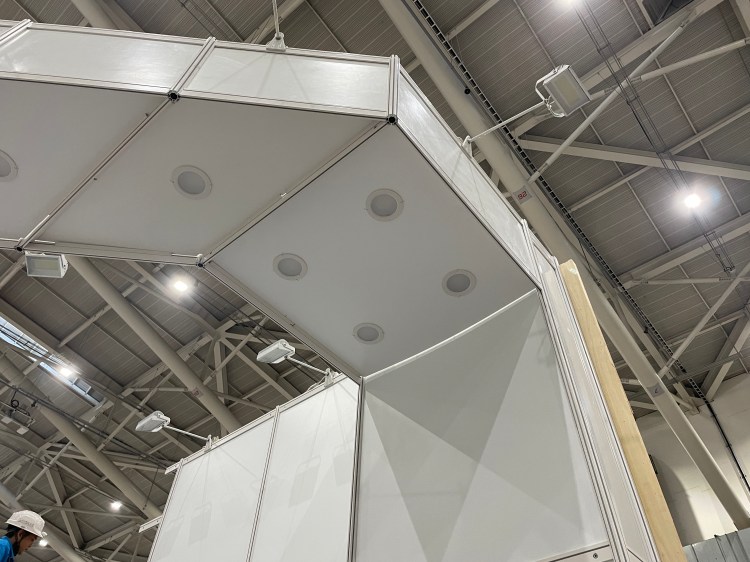 天花板嵌燈是安裝在展覽空間天花板中的燈具。這些燈具通常以固定的格局安裝,可以是點狀的燈源、燈條或面板燈。天花板嵌燈可以提供整體均勻的照明,營造出舒適的照明氛圍,同時也為展示區域提供光線照射。