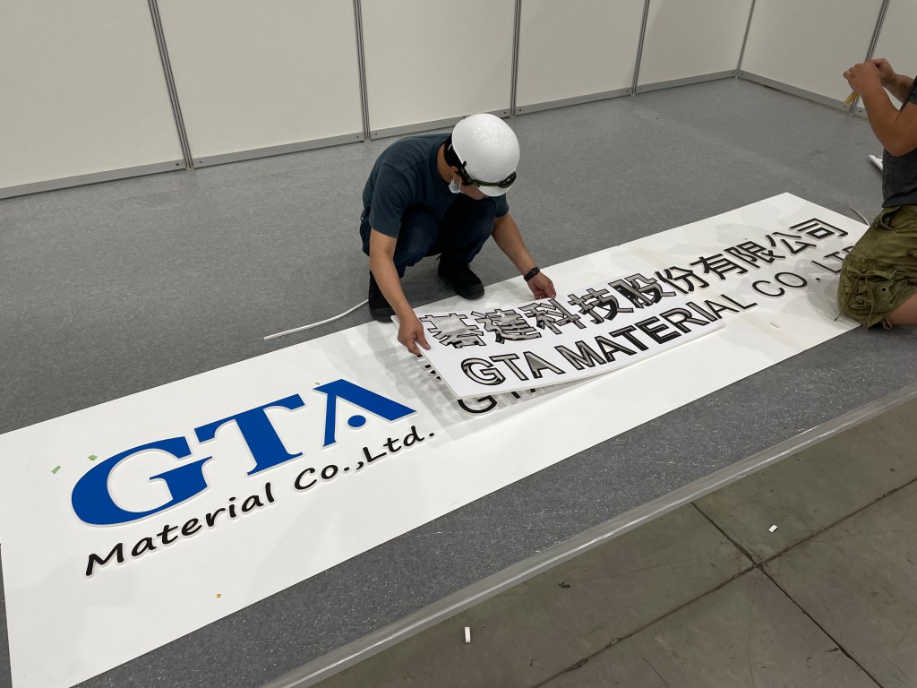 將切型LOGO字貼在中空板牆面上,搭配燈光做出質感,將攤位牆面做出百貨精品櫃位的質感。