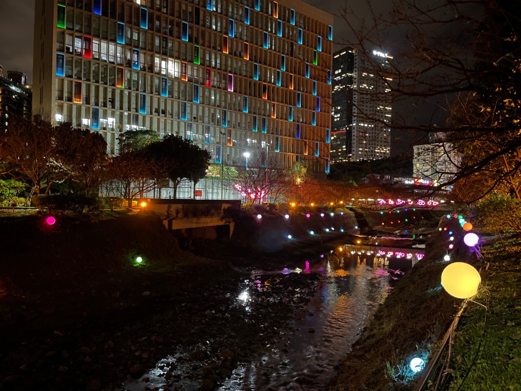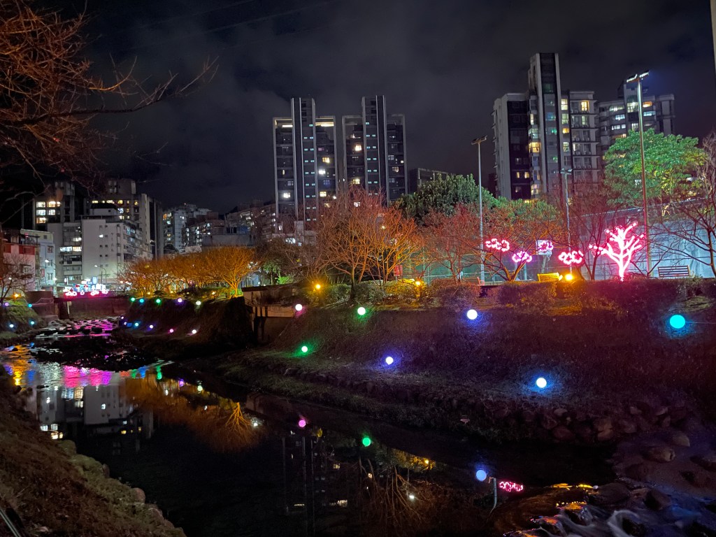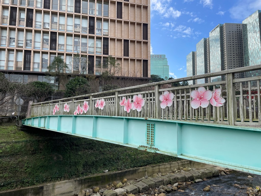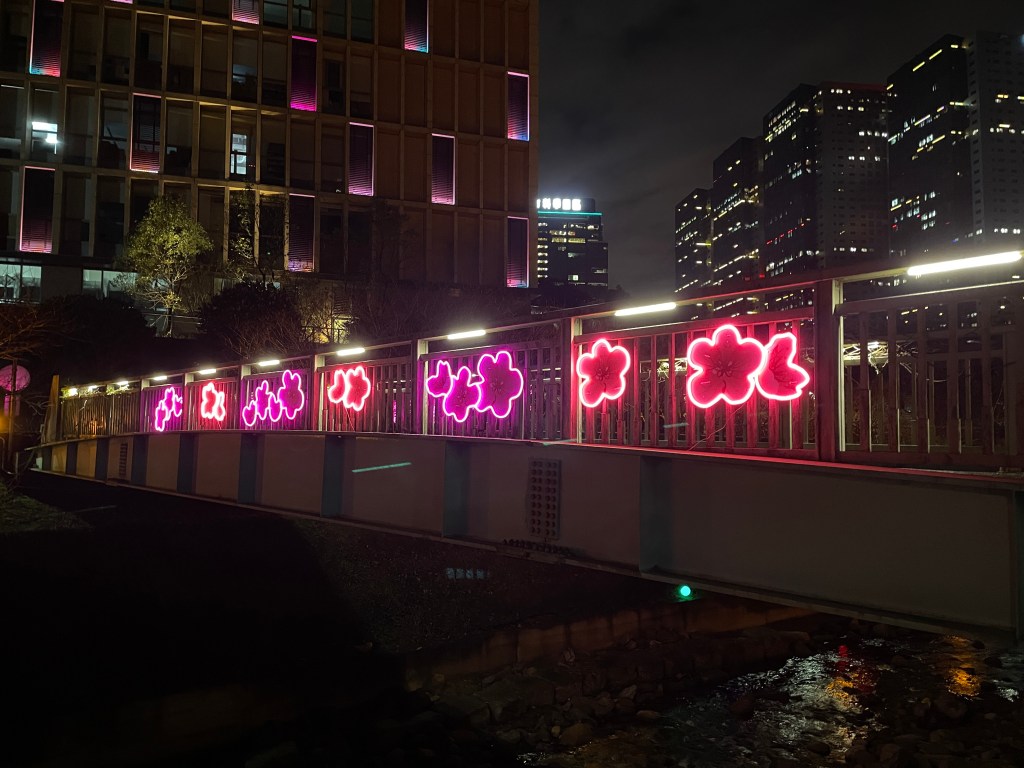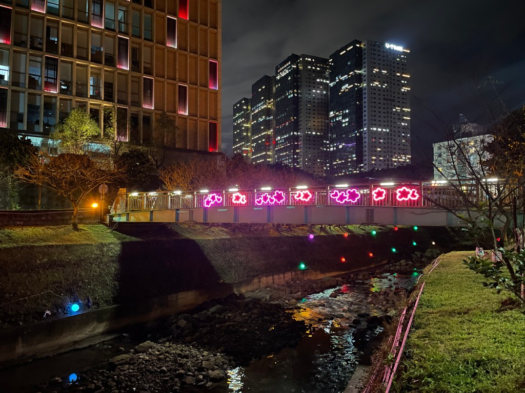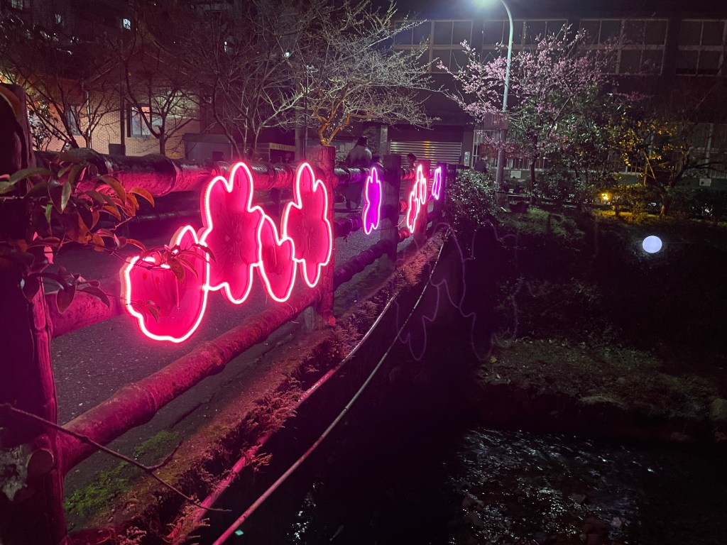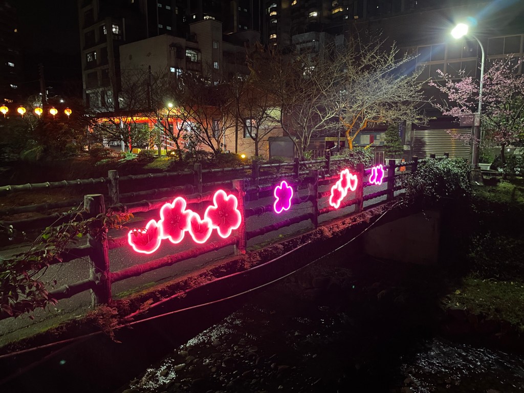 在河道中的橋樑上新增了粉色的LED櫻花燈飾,用跳色的配置營造活潑的感覺,增添夜間賞櫻的趣味與亮點。