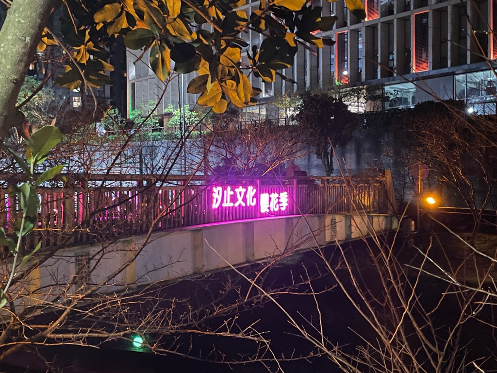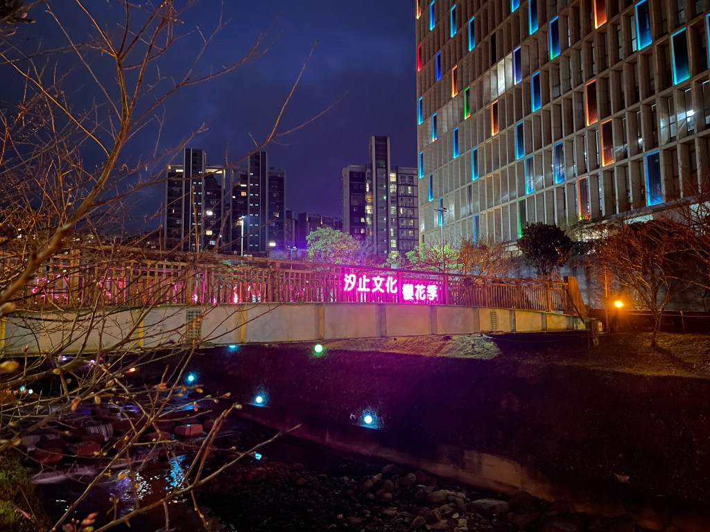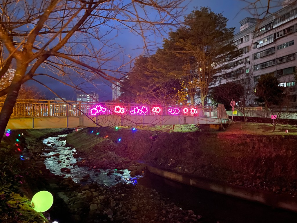採用櫻花主色粉紅色作為霓虹燈字顏色,製作出汐止文化櫻花季主題名稱燈字,懸掛在河道中的橋樑上增加亮點。