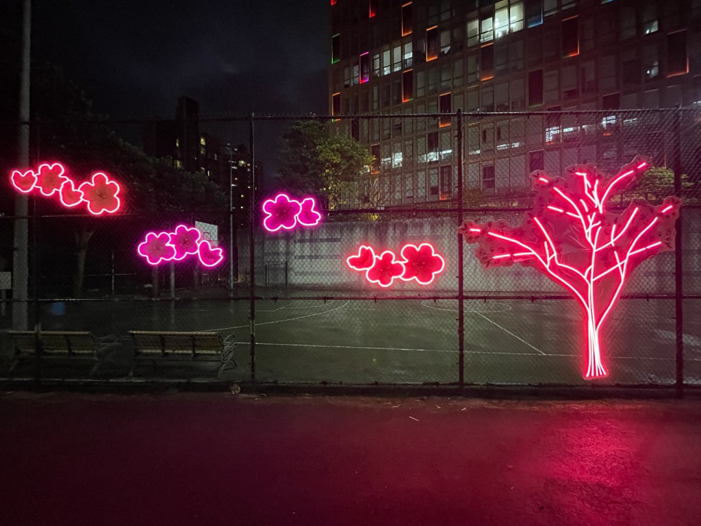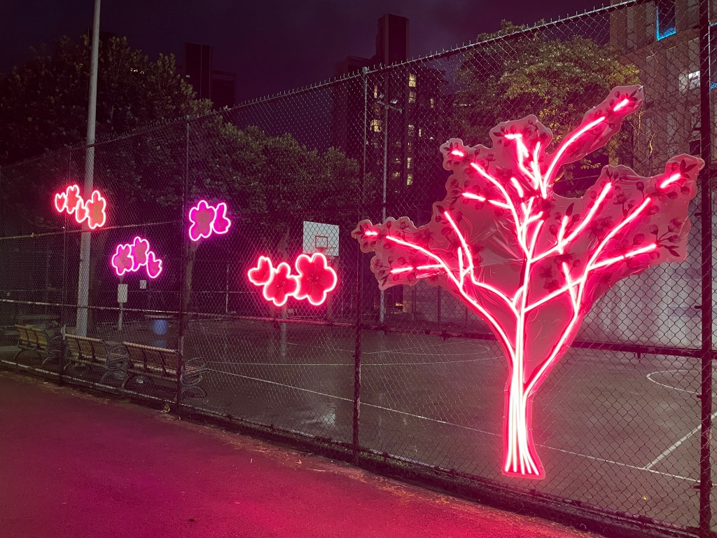 在櫻花步道邊的籃球場外牆重複使用了,去年極為吸睛的LED霓虹櫻花樹燈飾並搭配LED霓虹櫻花圖樣呈現櫻花飄揚,喜氣滿滿的氛圍。
