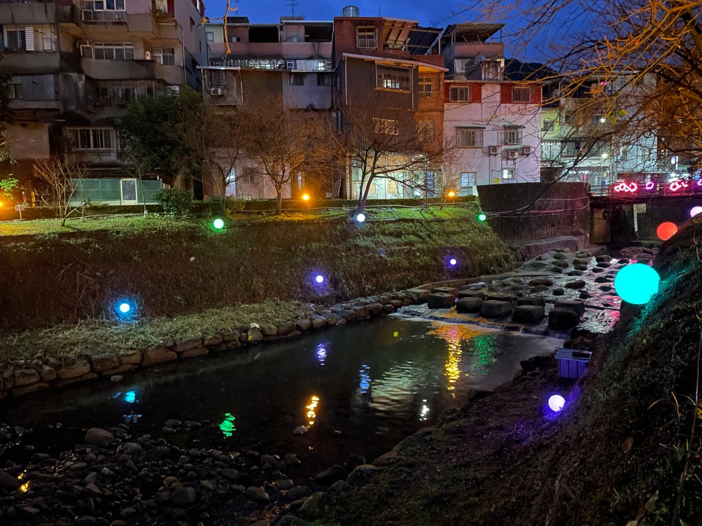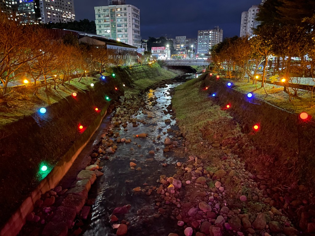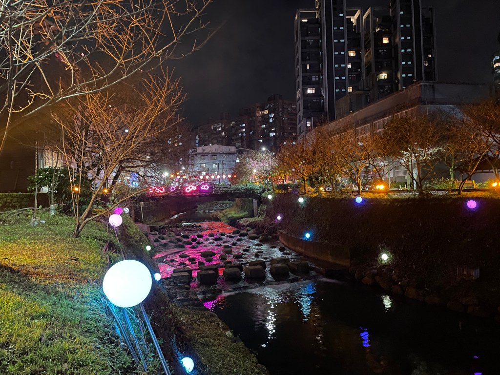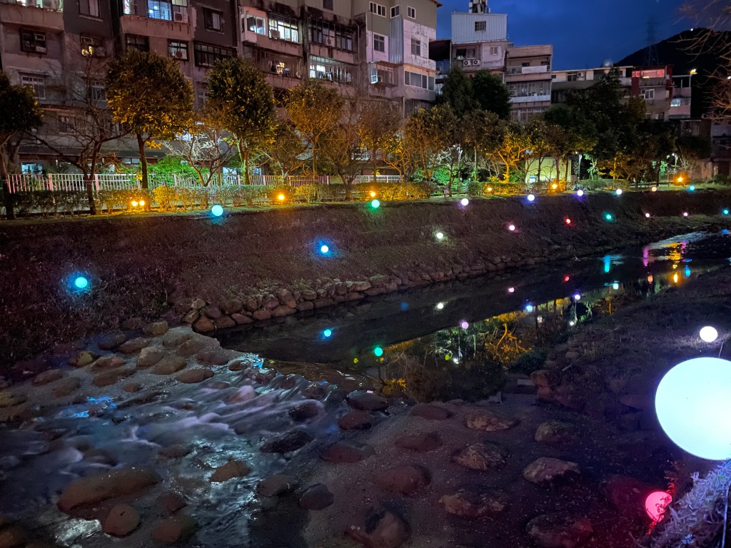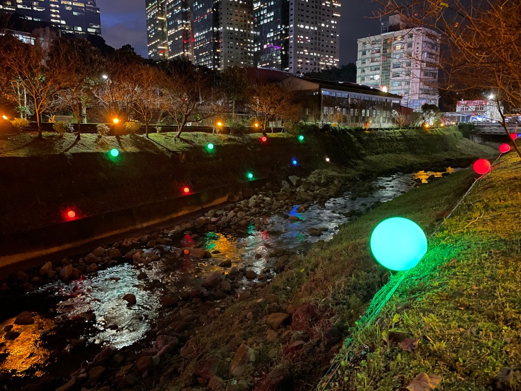 在河道的堤坡綠地上新增了七彩變色的LED圓球燈飾,透過LED球燈與水面的倒影營造優美的氣氛。