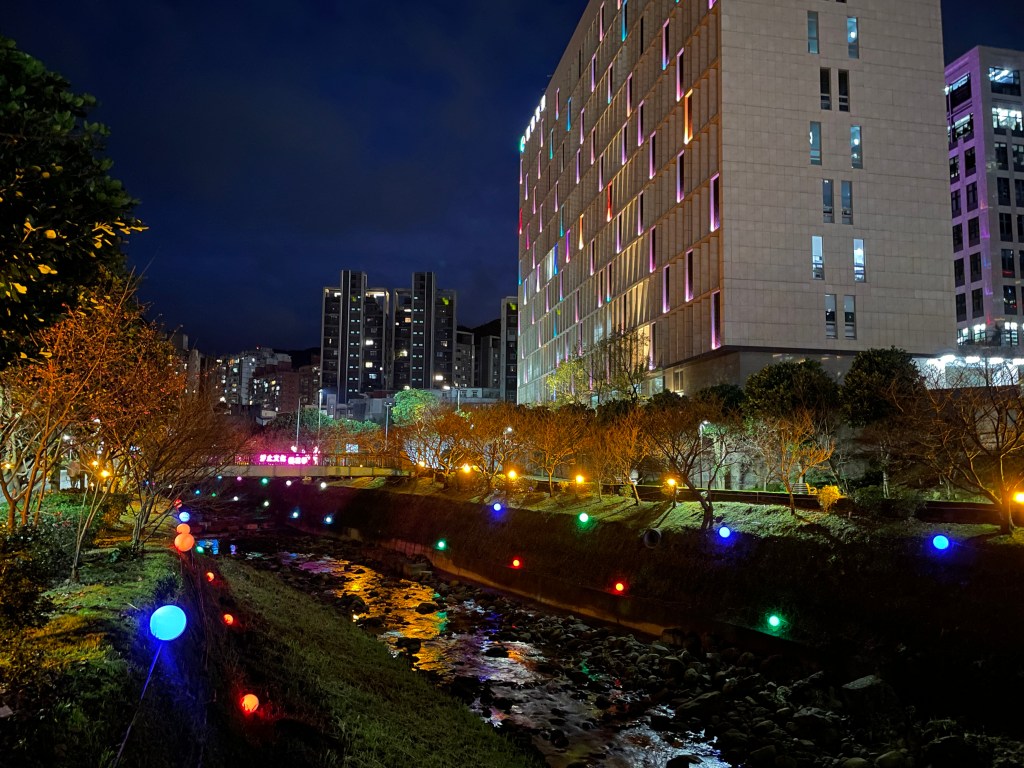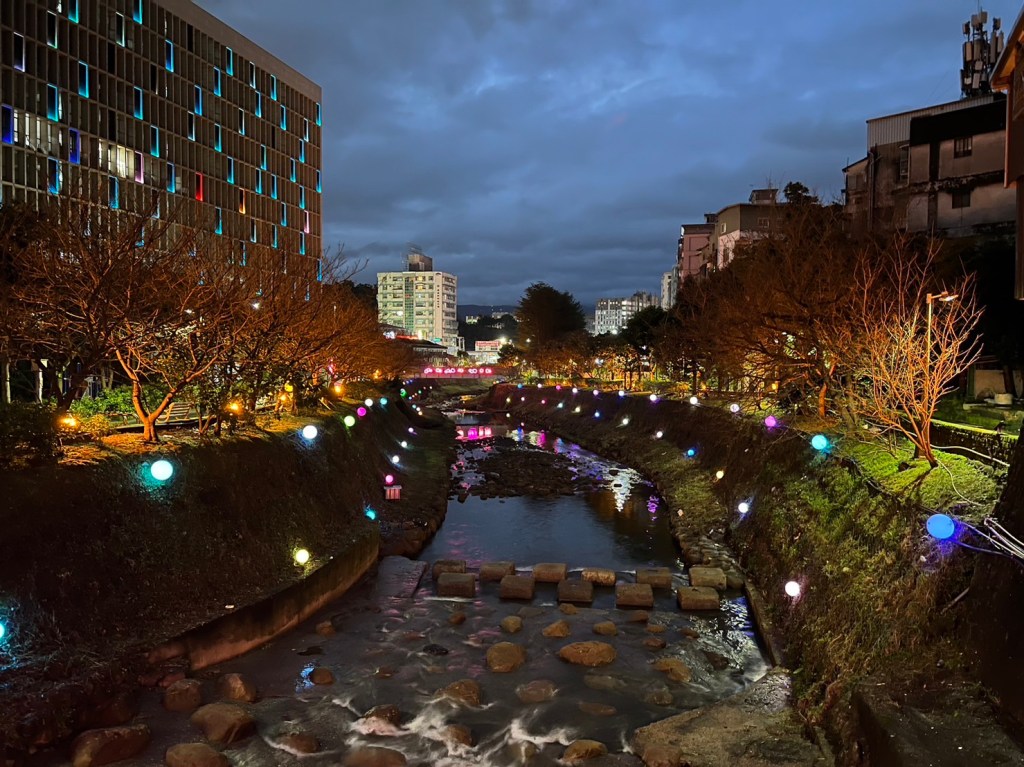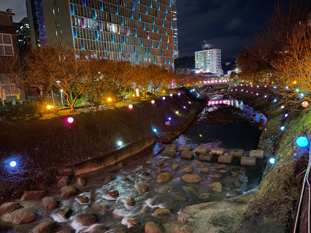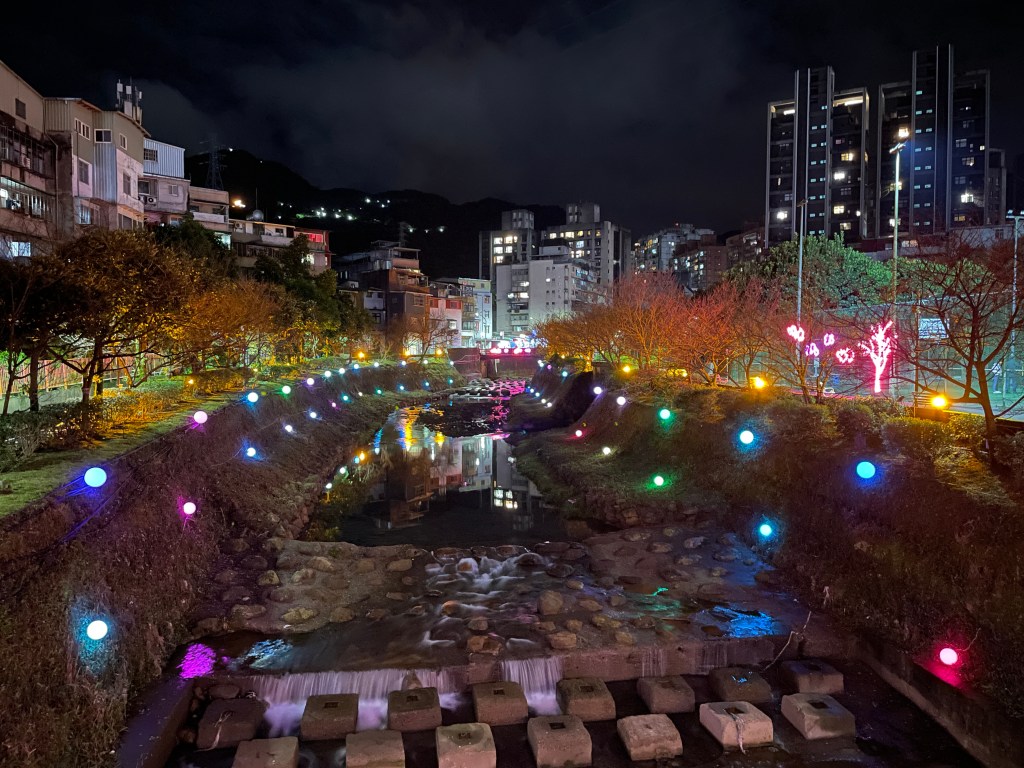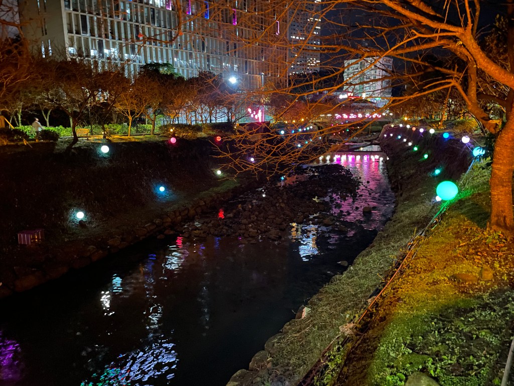 在河道的堤坡綠地上新增了七彩變色的LED圓球燈飾,透過LED球燈與水面的倒影營造優美的氣氛。