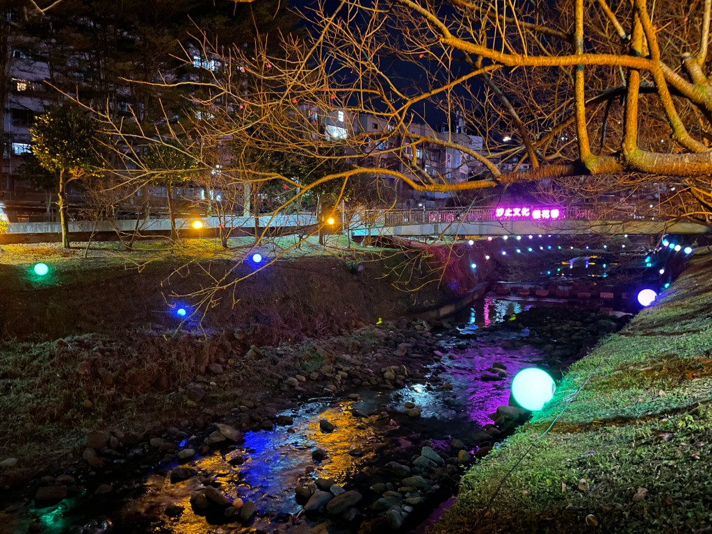 文化里康誥坑溪河道是今年規劃的重點,此次將大大小小且七彩變換的戶外LED圓球燈佈置於河道兩側,一路延伸至文化橋外圍,將原本昏暗的河道點亮,透過LED球燈與水面的倒影營造優美的氣氛。