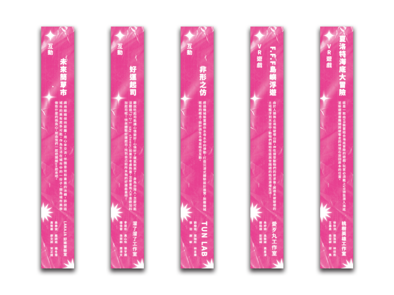 為了讓展場內容更多元更豐富,來做設計不只會根據展場來提供視覺形象的規劃,更會為畢業生們提出各種發想,相互討論後便將最好的呈現在觀展者面前。