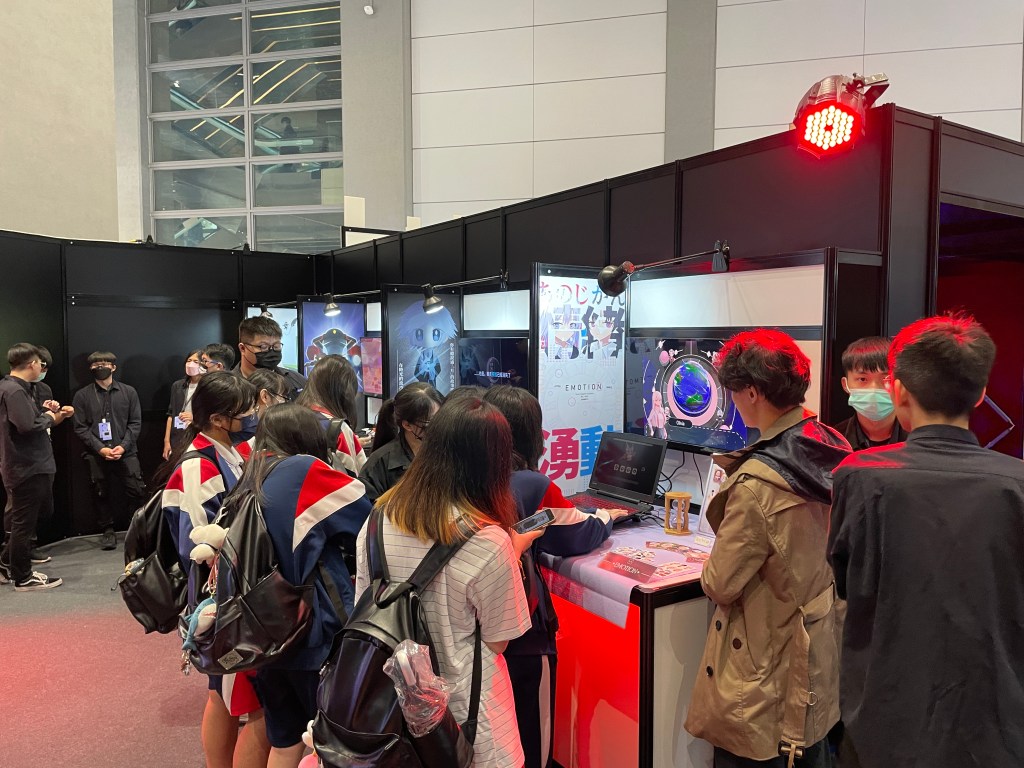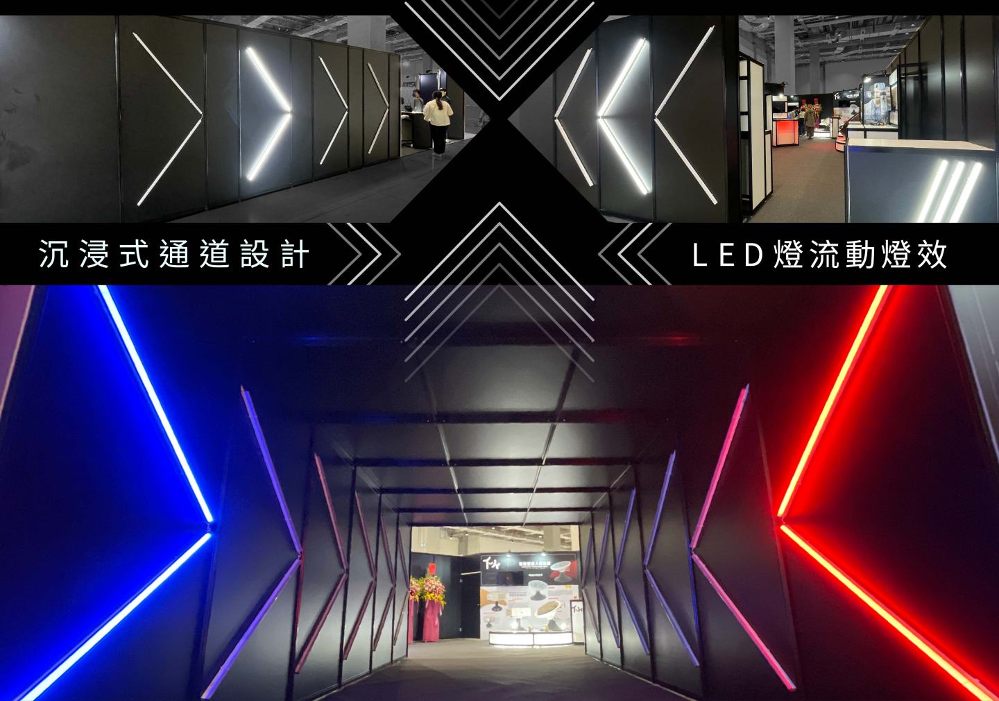 今年與建國設計的攤位,使用了大量日光燈管元素,在攤位外圍用白色日光東製作出跑燈的指引標示!將大家吸引到攤位入口的模型造型主視覺牆,穿過牆面後就可直接進入由紅色、藍色日光燈組成的迷幻隧道!而攤位展櫃則是結合了紅藍色燈管,用來營造氣氛外,更能明確區分組別,場內再加上Par燈投射,讓整體攤位氛圍拉滿。