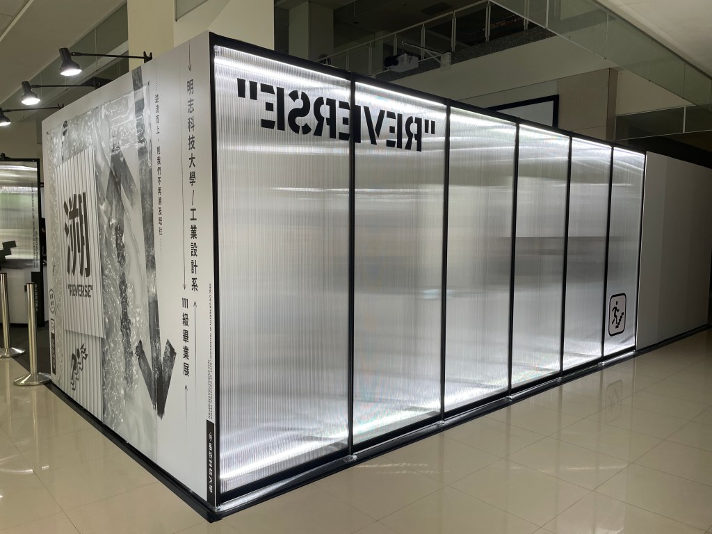 展場外牆使用半透明中空板呈現水透明及流動的意象,半透明透出部分展場內部與觀展者,製造出一種唯美帶神秘感的畫面,”REVERSE”字樣取回溯倒反的概念相反過來呈現。