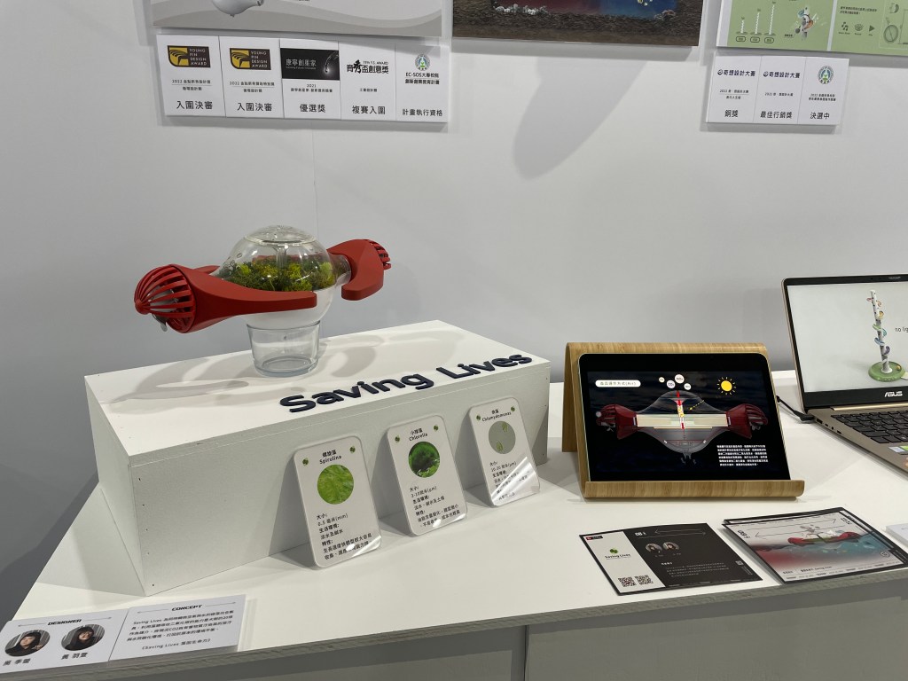 ≋Saving Lives 是一款能夠同時轉換空氣與水的綠藻光合載具,利用藻類吸收二氧化碳的能力是大樹的 20 倍作為創新媒介,將現況CO2與有害物質汙染高的空汙與水質酸化環境,打回於原本的環境平衡。此外,產品運用太陽能與水流發電,提供產品永續的能源,並搭配 GPS 系統與 PH 檢測器掌握水質狀況,藉此也達成SDGs 6、7、14 之永續發展目標。
