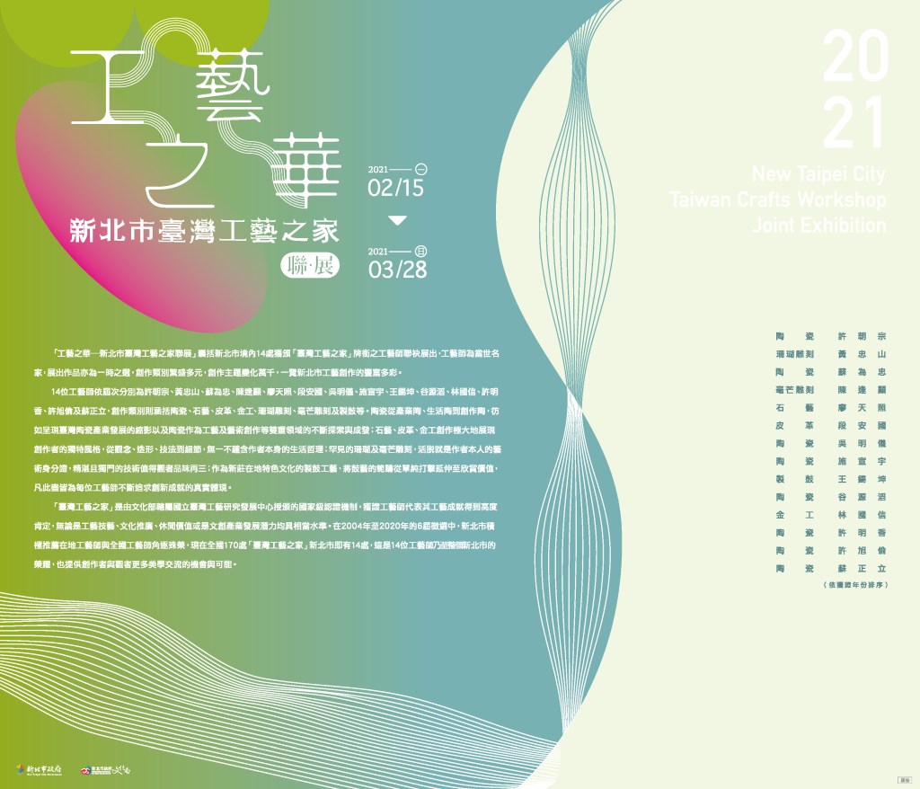 「工藝之華-新北市臺灣工藝之家」聯展,集結新北市14位國家級工藝師,共展出 7大類41件作品。此次展覽便是要協助行銷,讓更多人知道新北工藝與眾不同的特色,也要讓民眾無論在城市或偏鄉都能接觸藝文。