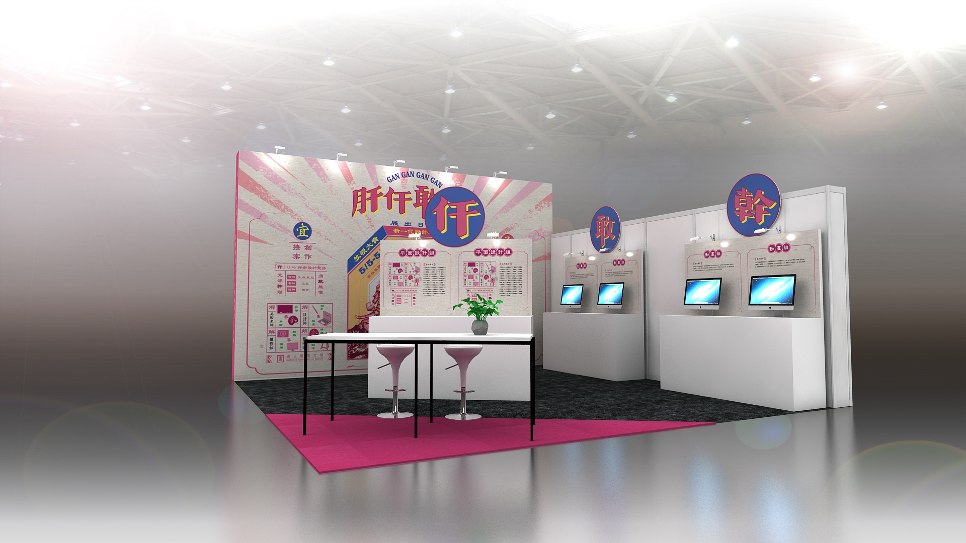 有時展覽場地還無法確認,不能實際場勘時,為了讓畢業生們能夠清楚知道實際展出時視覺形象會是如何呈現,來做設計會預先規劃一版3D示意圖,將你們用心設計的主視覺與形象元素結合到3D圖上,營造現場展出時的氛圍,即可馬上進行初步的討論,待展地確認進行場勘後,則會再提供確定版的3D示意圖